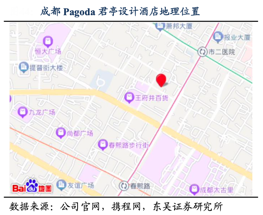 經(jīng)典案例:根據(jù)公司官網(wǎng)、攜程網(wǎng)、東吳證券研究所等綜合資訊表明,成都 Pagoda 于 2022 年 3 月 開業(yè),屬“Pagoda 君亭”品牌西南布局首店,其地理位置及酒店內(nèi)部設(shè)計頗有巧思。酒店位于西部文化產(chǎn)業(yè)中心高層,處于春熙路商圈,距離成都時尚中心——太古里僅 5 分鐘步程。