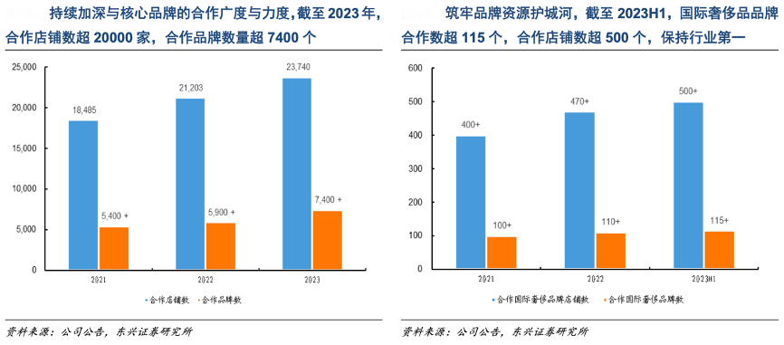經(jīng)典案例:根據(jù)公司公告、東興證券研究所等綜合資訊表明,華潤萬象生活在商業(yè)零售與服務領域多年的專業(yè)沉淀,構(gòu)筑起深厚的品牌資源護城河。公司持續(xù)加深與核心品牌的合作廣度與力度,截至 2023H1,國際奢侈品品牌合作數(shù)超 115 個,合作店鋪數(shù)超 500 個,保持行業(yè)第一;截 至 2023 年,合作店鋪總數(shù)超 20000 家,合作品牌數(shù)量超 7400 個。