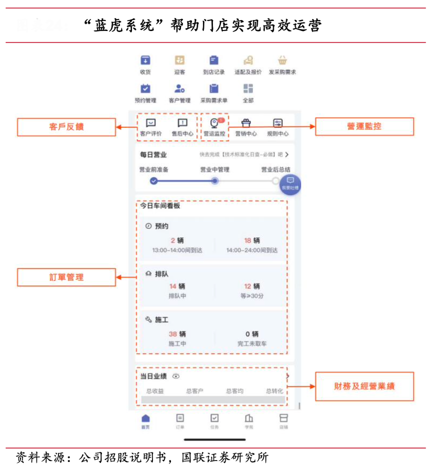 經(jīng)典案例:根據(jù)公司招股說明書、國聯(lián)證券研究所等綜合資訊表明,途虎養(yǎng)車公司打造了中國最大的汽車服務(wù)信息化管理系統(tǒng)“藍虎系統(tǒng)”,它提供了全面的汽車養(yǎng)護服務(wù)管理功能,包括預(yù)約管理、技師管理、配件管理、工單管理等,幫助門店實現(xiàn)高效運營。