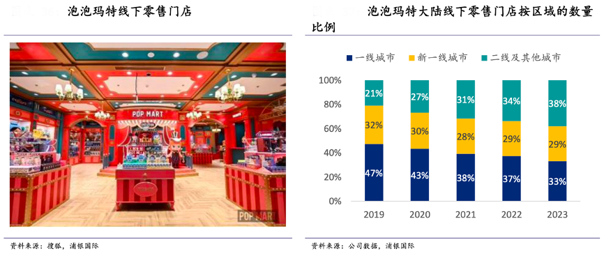 經(jīng)典案例:根據(jù)搜狐、公司數(shù)據(jù)、浦銀國際等綜合資訊表明,泡泡瑪特的每家線下 門店都試圖打造一個(gè)充滿童趣和夢幻感的空間,為消費(fèi)者帶去快樂美好的 沉浸式購物體驗(yàn)的同時(shí),同時(shí)也向消費(fèi)者傳遞自有藝術(shù)家 IP 的不同個(gè)性和 內(nèi)涵。截止到 2023 年底,泡泡瑪特在全國一共擁有 363 家線下門店,已基本覆蓋所有高線市場,并逐步向低線市場的主要商圈滲透。