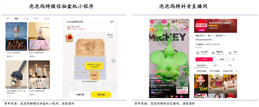 經(jīng)典案例:根據(jù)泡泡瑪特微信抽盒機(jī)小程序、泡泡瑪特抖音直播間、浦銀國際等綜合資訊表明,2024年上半年,泡泡瑪特公司也積極調(diào)整線上運(yùn)營策略,在抖音上開通了針對不同品類、不同使用場景以及藝術(shù)家 IP 的直播間,擴(kuò)大用戶觸達(dá)范圍的同時(shí)滿足更精準(zhǔn)用戶的需求。截至 2023 年,抖音渠道占公司線上收入的比例達(dá)到了 17%。