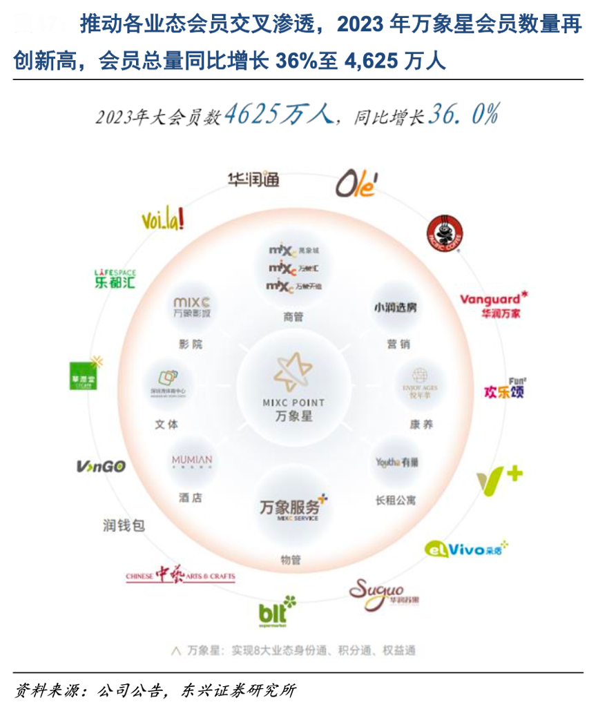 經(jīng)典案例:根據(jù)公司公告、東興證券研究所等綜合資訊表明,華潤萬象生活在2022 年整合資源打通各業(yè)態(tài)會員系統(tǒng),發(fā)布自有積分品牌“萬象星”,涵蓋營銷、康養(yǎng)、長租、酒店、文體、影業(yè)、商業(yè)與物業(yè)等八大業(yè)態(tài),實(shí)現(xiàn)各業(yè) 態(tài)客戶的身份通、積分通和權(quán)益通,持續(xù)提升會員滿意度與消費(fèi)貢獻(xiàn)度。截至 2023 年底,萬象星會員總量同比增長 36%至 4,625 萬人。