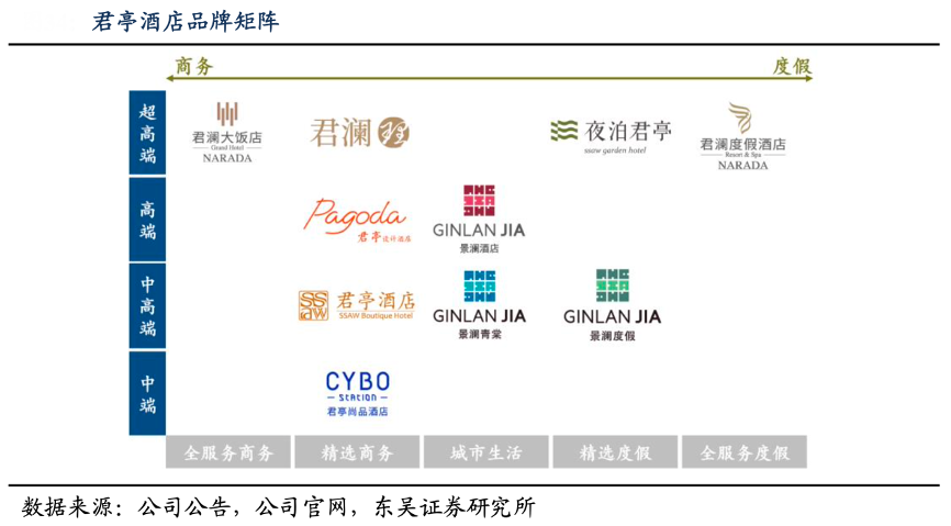 經(jīng)典案例:根據(jù)公司公告、公司官網(wǎng)、東吳證券研究所等綜合資訊表明,君亭品牌誕生于 2007 年,深耕中高端精選服 務(wù)酒店行業(yè)。截至 2022 年 2 月,君瀾品牌布局浙江、江蘇、海南等超 23 個(gè)省市,累計(jì)投資 管理超過(guò) 180 家酒店,景瀾布局遍及浙江、海南、吉林等 13 個(gè)省市,累計(jì)投資管理酒 店 75 家。