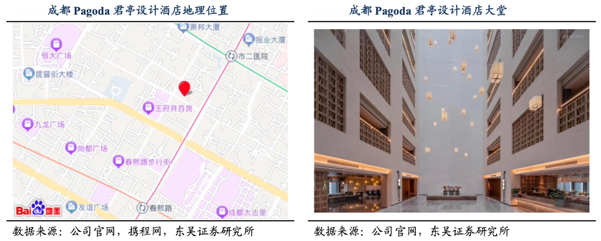 經(jīng)典案例:根據(jù)公司官網(wǎng)、攜程網(wǎng)、東吳證券研究所等綜合資訊表明,成都 Pagoda處于春熙路商圈,距離 成都時(shí)尚中心——太古里僅 5 分鐘步程。成都 Pagoda 大堂結(jié)合現(xiàn)代 AR 交互技術(shù),展示林俊廷先生作品《鎏瑩》,中庭采用獨(dú)特孔明燈設(shè)計(jì),營(yíng)造中式設(shè)計(jì)氛圍。