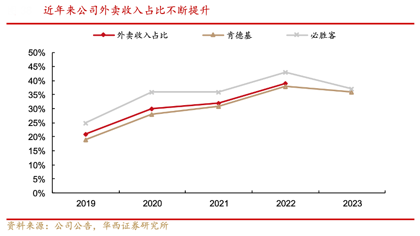經(jīng)典案例:根據(jù)公司公告、華西證券研究所等綜合資訊表明,顧客可通過外賣平臺(tái)和肯德基及必勝客的超級(jí) APPs 下達(dá)外賣訂單,而公司自有配送體系及專屬騎手保障高峰時(shí)段的配送能力、配送質(zhì)量和及時(shí)性。近年來,公司外賣收入占比不斷提升,肯德基和必勝客的外賣收入占比分別 從 2019 年的 19%/25%提升至 2023 年的 36%/37%。