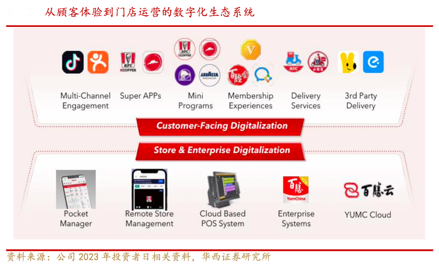 經(jīng)典案例:根據(jù)公司2023年投資者日相關(guān)資料、華西證券研究所等綜合資訊表明,自 2016 年以來,公司始終走在數(shù)字化和智能化的前沿,持續(xù)投資數(shù)字化基礎(chǔ)設(shè) 施,啟用位于上海、南京、西安三地的數(shù)字化研發(fā)中心。目前,公司一方面通過超級(jí) APP、小程序、會(huì)員體系、外送服務(wù)和第三方渠道等構(gòu)建數(shù)字化消費(fèi)者生態(tài)系統(tǒng),為消費(fèi)者提供高 品質(zhì)的服務(wù)及消費(fèi)體驗(yàn),推動(dòng)銷售增長(zhǎng);另一方面通過口袋經(jīng)理、企業(yè)管理系統(tǒng)、百勝云等賦能門店和 企業(yè)管理,提高運(yùn)營(yíng)和經(jīng)營(yíng)決策效率 。