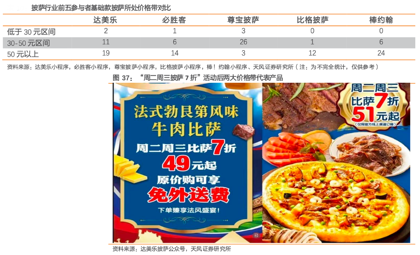 經(jīng)典案例:根據(jù)達(dá)美樂小程序、必勝客小程序、尊寶披薩小程序、比格披薩小程序、棒!約翰小程序、達(dá)美樂披薩公眾號(hào)、天風(fēng)證券研究所等綜合資訊表明,達(dá)美樂公司菜單所提供的披 薩價(jià)格低于較多競(jìng)爭(zhēng)者,據(jù)窄門餐眼,達(dá)美樂人均單價(jià)(57.86 元)低于必勝客(69.88 元)、比格披薩(72.35 元)、棒約翰(60.28 元)。除了提供可接近具有競(jìng)爭(zhēng)力的低價(jià)披薩,達(dá)美樂還為追求更優(yōu)質(zhì)披薩的顧客提供改變餅底和配料做升級(jí),菜單的多元化讓達(dá)美樂能夠向不同收入水平的廣泛顧客提供服務(wù)。