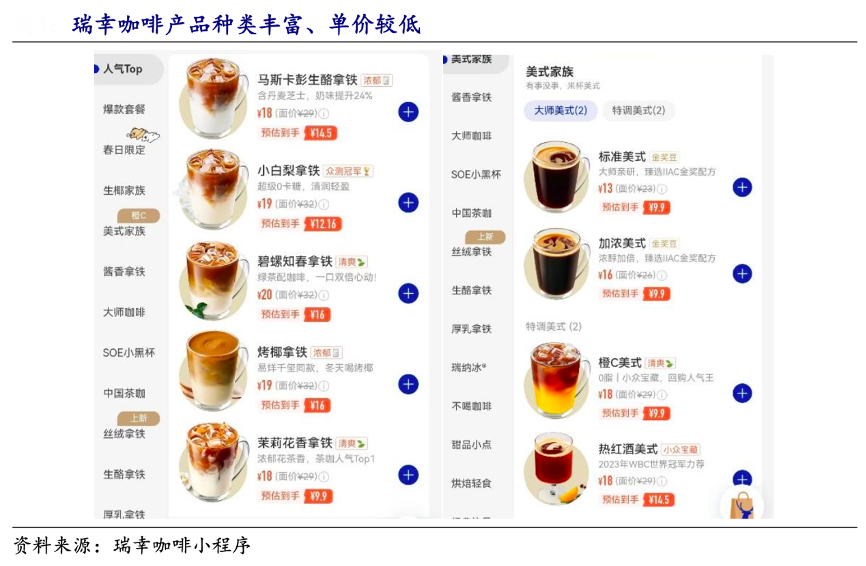 經(jīng)典案例:根據(jù)瑞幸咖啡小程序、開源證券研究所等綜合資訊表明,瑞幸咖啡主要定位“平 價、創(chuàng)新、快取”,將我國現(xiàn)磨咖啡帶入低單價、創(chuàng)新品、輕環(huán)境的全新消費場景。在產(chǎn)品價格上瑞幸咖啡定位大眾化、親民化,大多數(shù)咖啡產(chǎn)品價格位于 10-20 元價格帶;同時產(chǎn)品類型豐富多樣,包括乳類拿鐵、茶飲咖啡、美式等多樣化產(chǎn)品,滿足消費者對高品質(zhì)、多元化口味的需求。