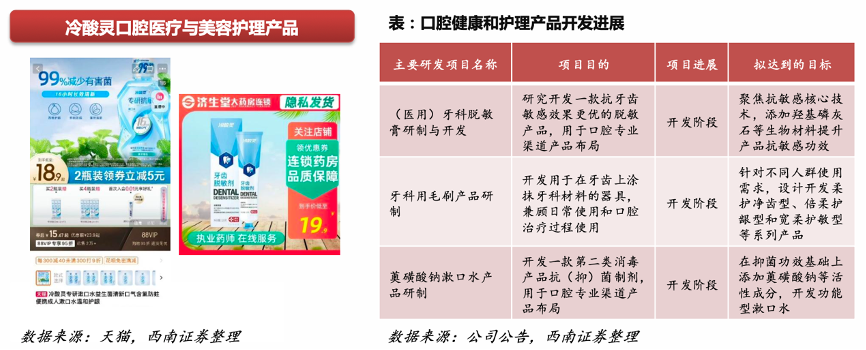經(jīng)典案例:根據(jù)公司公告、天貓、西南證券等綜合資訊表明,登康口腔公司口腔健康和美容護(hù)理類產(chǎn)品包括口腔醫(yī)療器械(牙 齒脫敏劑)、口腔衛(wèi)生用品(口腔抑菌膏、口腔抑菌護(hù)理液等)、正畸護(hù)理系列(正畸刷、保持器清潔片 等)、牙線系列、漱口水系列、口腔噴霧等,產(chǎn)品矩陣豐富。其中牙齒脫敏劑等械字號(hào)產(chǎn)品以及部分口腔抑菌產(chǎn)品已經(jīng)進(jìn)入OTC渠道銷售,打開了公司醫(yī)療專業(yè) 渠道的市場(chǎng)空間。