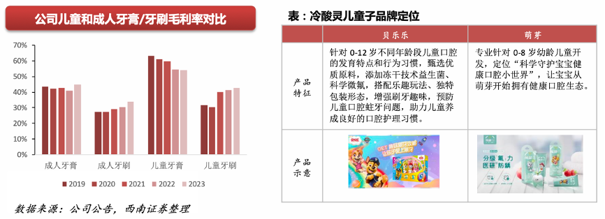 經(jīng)典案例:根據(jù)公司公告、西南證券等綜合資訊表明,目前冷酸靈擁有兩個(gè)兒童賽道子品牌——兒童口腔護(hù)理品牌“貝樂樂”和高端嬰童口腔護(hù)理品牌“萌芽“,產(chǎn)品開發(fā)側(cè)重于安全溫和防齲、有輔助教學(xué)刷牙功能、有趣味性等。