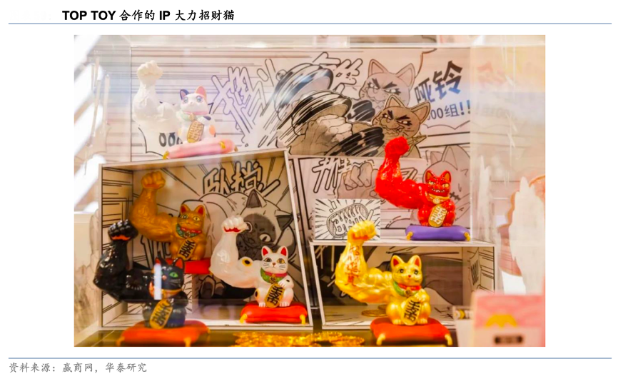 經(jīng)典案例:根據(jù)贏商網(wǎng)、華泰研究等綜合資訊表明,截至 2022 年 12 月 31 日,TOP TOY 已與 20 位 IP 許可方聯(lián)名開發(fā)出 300 逾款 TOP TOY 品牌下的 IP 產(chǎn)品。 以暢銷款 IP 大力招財貓為例,TOP TOY 便是直接與藝術(shù)家徐振邦進行合作,通過供應(yīng)鏈與營銷的賦能,將IP與產(chǎn)品結(jié)合推向消費者。