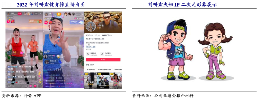 經(jīng)典案例:根據(jù)抖音APP、公司業(yè)績會推介材料、開源證券研究所等綜合資訊表明,2021 年巨星合作頭部 MCN 機構(gòu)無憂傳媒,抓住了疫情期間網(wǎng)民居家健身的外部訴求和抖音頭部健身 KOL 缺位的機遇,將劉畊宏成功運營為超級健身 KOL,使其在抖音的粉絲量自 2022 年 4 月的 500 萬左右,增長至 2022 年末的 7150 萬,成為抖音歷史上月度增粉最高 的賬號。