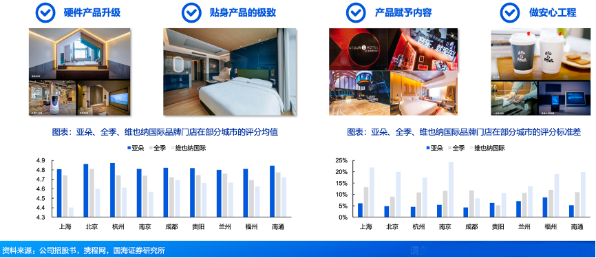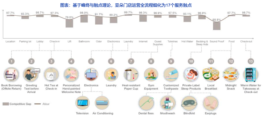 經(jīng)典案例:根據(jù)公司招股書、國海證券研究所等綜合資訊表明,亞朵服務(wù)以峰終觸點為底層理論,將門店從預(yù)定到退房的運(yùn)營全流程細(xì)分為17個服務(wù)觸點,為用戶提供了遠(yuǎn)超同行的入住體驗,根據(jù)Brand Wisdom調(diào)研數(shù)據(jù)顯示,亞朵在17個觸點中均獲得行業(yè)最高的用戶好評率。