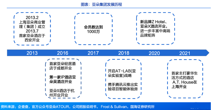 經(jīng)典案例:根據(jù)企查查、官方公眾號亞朵ATOUR、公司招股說明書、Frost&Sullivan、公司公告、國海證券研究所等綜合資訊表明,亞朵集團(tuán)是始于住宿的生活方式品牌集團(tuán),「中國體驗」倡導(dǎo)者。公司在以中高端為主力的基礎(chǔ)上,自主孵化定位中端的輕居酒店與定位高端的S酒店。2020年9月,新品牌Z Hotel、亞朵X酒店開業(yè);2021年6月首家主打豪華生活方式的酒店 A.T. House在上海開業(yè),品牌矩陣得到進(jìn)一步完善。