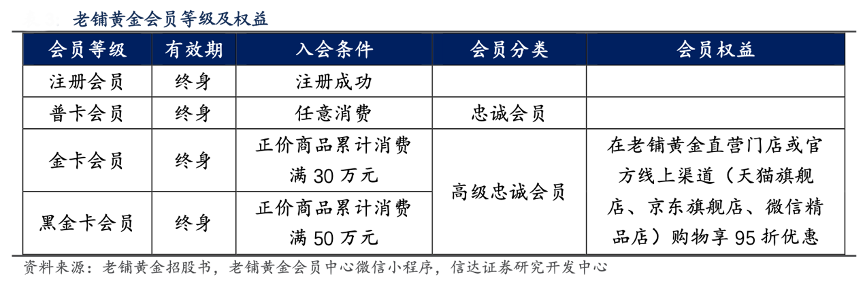 經(jīng)典案例:根據(jù)老鋪黃金招股書、老鋪黃金會員中心微信小程序、信達證券研究開發(fā)中心等綜合資訊表明,老鋪黃金公司會員分為四大等級,任意消費即可成為忠誠會員,累計正價商品消費金額達到 30 萬元即為高級忠誠會員,可享受官方購買渠道 95 折的優(yōu)惠權益。