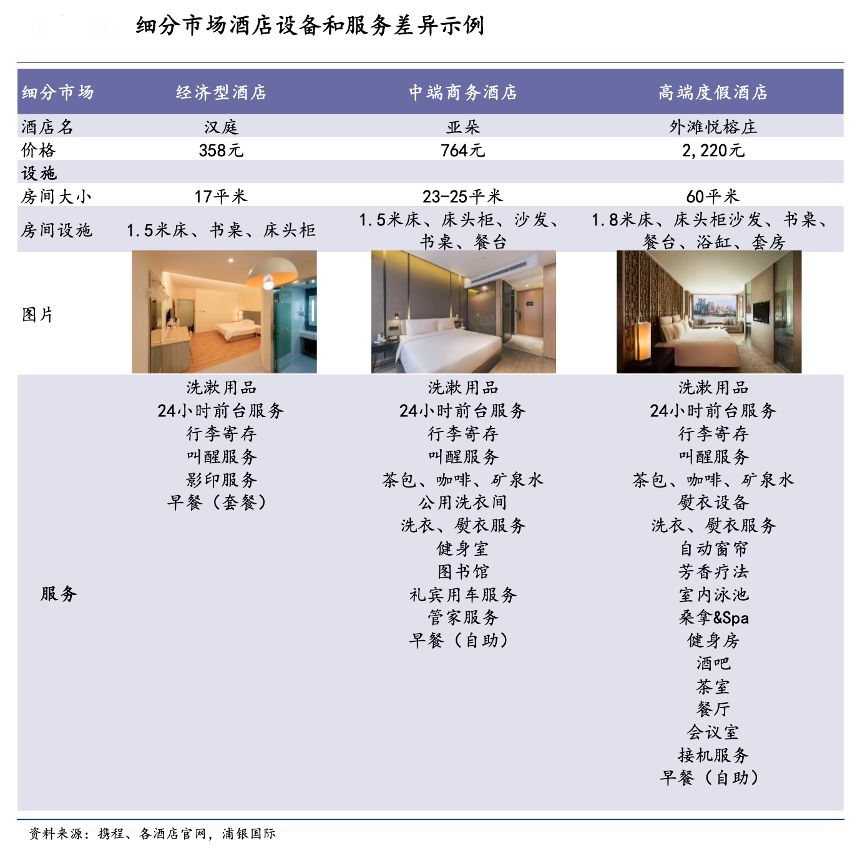 經(jīng)典案例:根據(jù)攜程、各酒店官網(wǎng)、浦銀國際等綜合資訊表明,高端度假酒店滿足高端人士對居住環(huán)境和服務(wù)的高需求,酒店周邊風(fēng)景更加怡人,客房更大、服務(wù)更客制化。相比高端酒店,經(jīng)濟(jì)型酒店所提供的設(shè)施以及服務(wù)相對有限,但也能滿足普通商旅和休閑消費(fèi)者的基本需求。