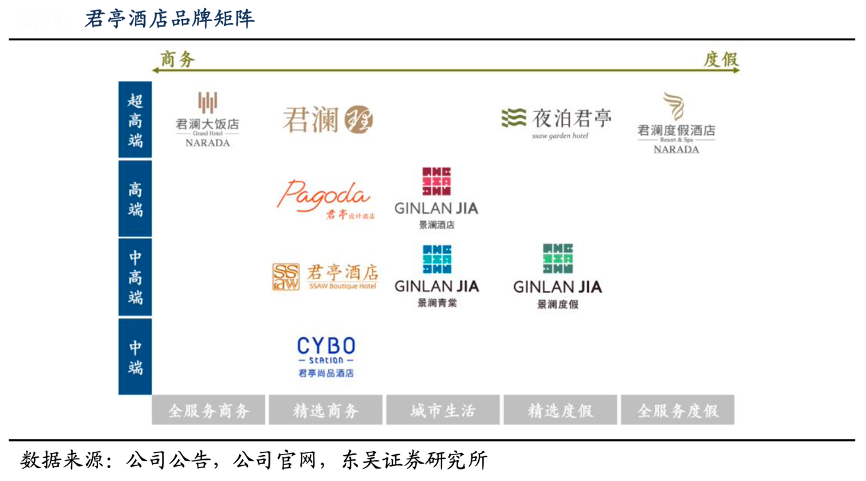 經(jīng)典案例:根據(jù)公司公告、公司官網(wǎng)、東吳證券研究所等綜合資訊表明,君亭品牌誕生于 2007 年,截至 2022 年 2 月,君瀾品牌布局浙江、江蘇、海南等超 23 個(gè)省市,累計(jì)投資 管理超過(guò) 180 家酒店;收購(gòu)?fù)瓿珊螅?shí)現(xiàn)規(guī)模躍遷,正式躋身于國(guó)內(nèi)民族酒店集團(tuán)前列,至此, 君亭的品牌矩陣進(jìn)一步完善,完成對(duì)中高端和高端商務(wù)以及休閑品牌的全覆蓋。