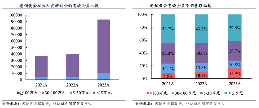 經(jīng)典案例:根據(jù)老鋪黃金招股書、信達(dá)證券研究開發(fā)中心等綜合資訊表明,老鋪黃金忠誠會員人數(shù)快速增長,高級別會員銷售貢獻(xiàn)持續(xù)提升。2023 年,在老鋪黃金購買至少一 次的忠誠會員人數(shù)翻倍以上增長,達(dá)到 9.3 萬人,同比增幅 131%。其中,年消費(fèi)額 100 萬 元及以上的忠誠會員貢獻(xiàn)了公司 15.9%的收入。