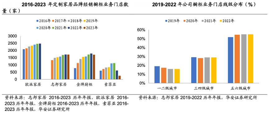 經典案例:根據(jù)志邦家居2016-2023歷年年報、歐派家居2016-2023歷年年報、金牌櫥柜2016-2023歷年年報、索菲亞家居2016-2023歷年年報、華安證券研究所等綜合資訊表明,志邦家居積累了大量優(yōu)質經銷商與門店資源,2024Q1 公司櫥 柜經銷門店數(shù)量 1759 家,較 2023 年末增加 44 家,門店數(shù)量有所擴張。從門店線級分布來看,2022 年公司經 銷渠道櫥柜業(yè)務一二級城市收入占 16%,三四級城市收入占 29%,五六級城市收 入占 55%,渠道不斷下沉。