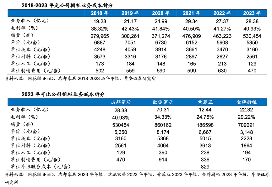 經典案例:根據(jù)志邦家居2018-2023歷年年報、志邦家居2023年年報、歐派家居2023年年報、索菲亞2023年年報、金牌櫥柜2023年年報、同花順iFinD、華安證券研究所等綜合資訊表明,志邦家居公司業(yè)務規(guī)模持續(xù)擴張,2023 年公司櫥柜業(yè)務毛利率為 40.93%,同期歐派家居/金牌廚柜/索菲亞/皮阿諾/好萊客 廚柜業(yè)務毛利率分別為 34.33%/29.22%/24.75%/26.95%/26.07%,顯著領先于行業(yè)競爭對手。