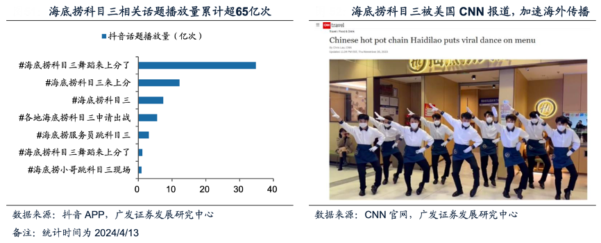經(jīng)典案例:根據(jù)抖音APP、CNN官網(wǎng)、廣發(fā)證券發(fā)展研究中心等綜合資訊表明,除主動(dòng)營(yíng)銷之外,海底撈公司優(yōu)質(zhì)服務(wù)典型出圈案例為“科目三”,海底撈員工為顧客表演舞蹈后,顧客拍攝并自發(fā)上傳到社交媒體,引起 廣泛傳播,據(jù)抖音APP,截至2024年4月13日,抖音平臺(tái)海底撈科目三相關(guān)話題累計(jì)播放量超65億次,成為現(xiàn)象級(jí)事件。同時(shí)海底撈科目三也被美國(guó)CNN報(bào)道,加速其在海外的傳播。