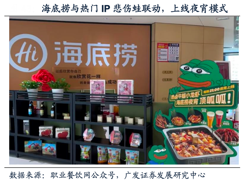 經(jīng)典案例:根據(jù)職業(yè)餐飲網(wǎng)公眾號(hào)、廣發(fā)證券發(fā)展研究中心等綜合資訊表明,2023年暑期海底撈近1000家門(mén)店每晚上線(xiàn)夜宵,增加小龍蝦、鹵味、牛蛙鍋、精釀啤酒等產(chǎn)品,聯(lián)動(dòng)熱門(mén)IP悲傷蛙,每晚定時(shí)發(fā)起猜拳活動(dòng)。