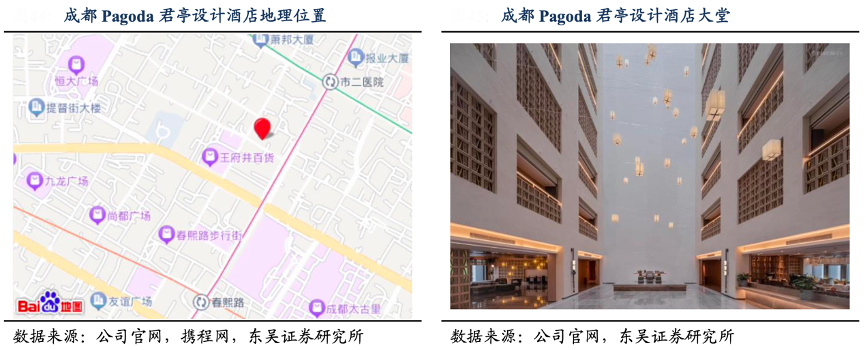 經(jīng)典案例:根據(jù)公司官網(wǎng)、攜程網(wǎng)、東吳證券研究所等綜合資訊表明,成都 Pagoda 于 2022 年 3 月 開業(yè),成都 Pagoda 大堂結(jié)合現(xiàn)代 AR 交互技術(shù),展 示林俊廷先生作品《鎏瑩》,中庭采用獨(dú)特孔明燈設(shè)計(jì),營(yíng)造中式設(shè)計(jì)氛圍。