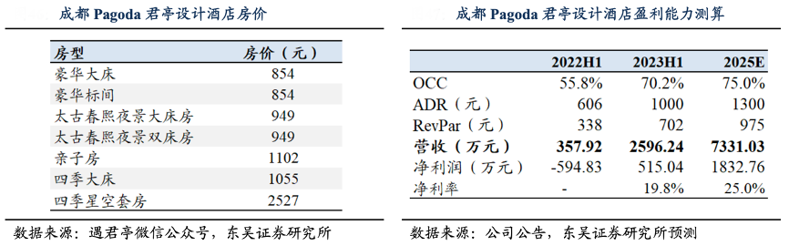 經(jīng)典案例:根據(jù)遇君亭微信公眾號(hào)、公司公告、東吳證券研究所等綜合資訊表明,成都 Pagoda 開業(yè)以來(lái)獨(dú)特的設(shè)計(jì)風(fēng)格吸引大量顧客打卡,小紅書上成都 Pagoda 酒店 tag 熱度達(dá) 17 萬(wàn)次瀏覽。2023 年 H1,成都 Pagoda 實(shí) 現(xiàn)營(yíng)業(yè)收入 2596.24 萬(wàn)元,RevPAR 為 702 元,同比+108%。