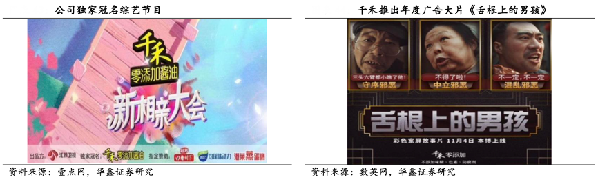 經(jīng)典案例:根據(jù)壹點(diǎn)網(wǎng)、數(shù)英網(wǎng)、華鑫證券研究等綜合資訊表明,千禾通過贊助熱門綜藝節(jié)目、電視廣告投放、抖音/B 站等新媒體投放,公司多年持續(xù)獨(dú)家冠名綜藝節(jié)目《新相親大會(huì)》塑造品牌價(jià)值觀,發(fā)布廣告片《舌根上的 男孩》,通過魔幻的神奇表現(xiàn)手法,引發(fā)了廣泛關(guān)注和熱議。