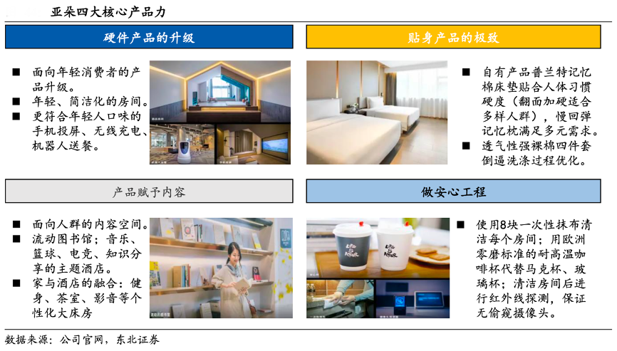 經典案例:根據公司官網、東北證券等綜合資訊表明,亞朵始終將高品質作為酒店競爭力的基礎,在產品硬件上基于年輕一代的需求進行升級,以“看得見”的優(yōu)質貼身產品提升顧客睡眠體驗,通過可翻轉具有雙面硬度的普蘭特記憶棉床墊、支撐力較強的慢回彈記憶枕、透氣性強且高衛(wèi)生標準的四件套等床品保障顧客的睡眠質量; 以個性化內容賦能產品,通過流通圖書館等具有內容的空間設計賦能產品,同時針對顧客需求推出健身大床房、冥想大床房等個性化產品。