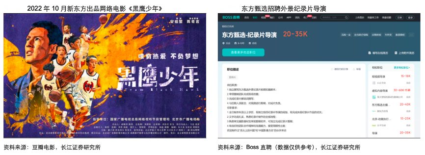 經(jīng)典案例:根據(jù)豆瓣電影、Boss直聘、長江證券研究所等綜合資訊表明,除了直播間中一系列嘉賓做客、外景直播內(nèi)容,新東方集團(tuán)已作為出品人于2022年 10 月全網(wǎng)上線電影《黑鷹少年》,并通過 11 月新開的“東方甄選看世界”抖音號持續(xù)創(chuàng)作人文旅游內(nèi)容。