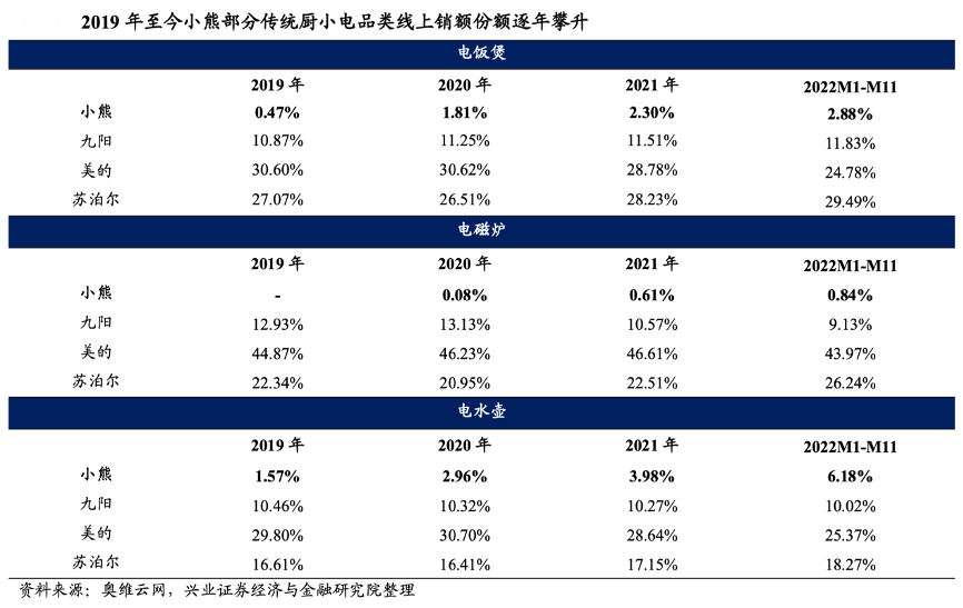 經(jīng)典案例:根據(jù)奧維云網(wǎng)、興業(yè)證券經(jīng)濟(jì)與金融研究院等綜合資訊表明,小熊產(chǎn)品多主打單人款,外觀設(shè)計(jì)偏向年輕化、時(shí)尚化,注重性價(jià)比。 以電飯煲為例,小熊產(chǎn)品主打一人食小容量,產(chǎn)品定價(jià) 150 元左右,遠(yuǎn)低于美蘇九電飯煲 200-400 元的均價(jià),形成差異化競(jìng)爭(zhēng)。結(jié)合奧維數(shù)據(jù),2019 年至今小熊在 電飯煲、電磁爐、電水壺等傳統(tǒng)小家電品類線上銷(xiāo)額份額逐年攀升。