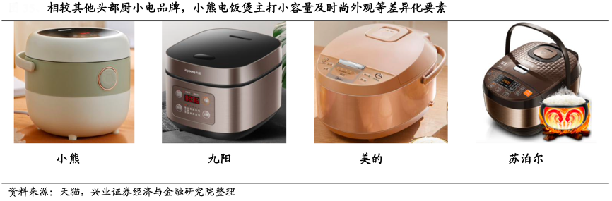 經(jīng)典案例:根據(jù)天貓、興業(yè)證券經(jīng)濟與金融研究院等綜合資訊表明,小熊公司目前已進(jìn)入傳統(tǒng)小家電市場,區(qū)別于美九蘇,其產(chǎn)品多主打單人款,外觀設(shè)計偏向年輕化、時尚化,注重高性價比。以電飯煲為例,小熊產(chǎn)品主打一人食小容量,產(chǎn)品定價 150 元左右,遠(yuǎn)低于美蘇九電飯煲 200-400 元的均價,形成差異化競爭。