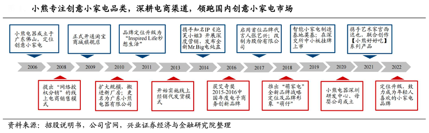 經(jīng)典案例:根據(jù)招股說明書、公司官網(wǎng)、興業(yè)證券經(jīng)濟(jì)與金融研究院等綜合資訊表明,小熊電器 2006 年成立于廣東佛山,多年來專注于創(chuàng)意小家電研發(fā)、設(shè)計(jì)、生產(chǎn)和銷售。其以酸奶機(jī)等長(zhǎng)尾品類起家,把握電商時(shí)代紅利,完善線上渠道布局,打造高性價(jià)比、時(shí)尚年輕的品牌形象,成為國(guó)內(nèi)領(lǐng)先的創(chuàng)意小家電龍頭。