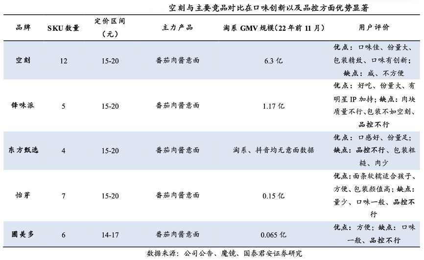 經(jīng)典案例:根據(jù)公司公告、魔鏡、國泰君安證券研究等綜合資訊表明,與之相比,空刻公司具備顯著的性價比優(yōu)勢,價格角度,空刻意面比品牌餐飲意面便宜 45%以上。同時,從口味角度,傳統(tǒng)意面口味清淡,不符合中國人口味,寶立在做西餐本土化方面具備充足的能力和經(jīng)驗,因此空刻做出的意面醬料濃郁,更符合中國人消費習慣。