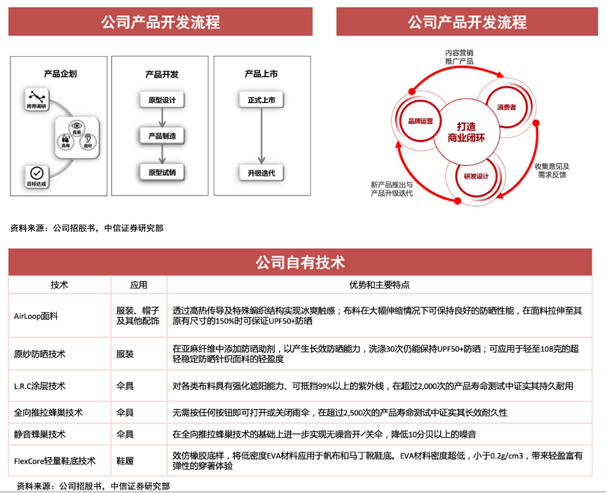 經(jīng)典案例:根據(jù)公司招股書、中信證券研究部等綜合資訊表明,蕉下突出前衛(wèi)的開發(fā)理念、扎實的研發(fā)功底、獨特的研發(fā)流程與供應(yīng)鏈端數(shù)字化柔性生產(chǎn),賦能精選單品戰(zhàn)略。