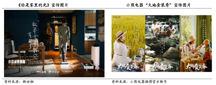 品牌上,2022 年 5 月小熊電器將品牌戰(zhàn)略定位為“年輕人喜歡的小家電”,其 11 月發(fā)布的“大地食裝秀”系列視頻,構(gòu)建了戶外的沉浸式場(chǎng)景,在稻香中用 電飯煲煮飯、在玫瑰園里用養(yǎng)生壺煮玫瑰花茶等畫面迎合了當(dāng)代年輕人對(duì)小家電 的儀式感、促進(jìn)精致生活的要求,傳達(dá)了品牌“精致”的生活理念。