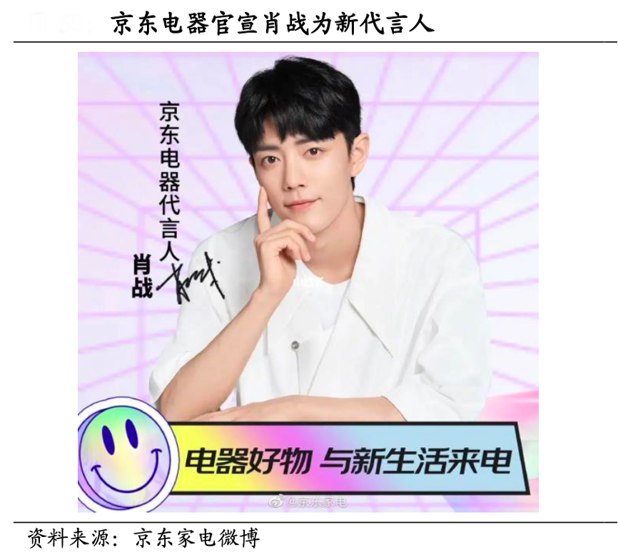 經(jīng)典案例:根據(jù)京東家電微博、國海證券研究所等綜合資訊表明,家電行業(yè)品牌代言人年輕且流量化。截至2022 年 11 月,肖戰(zhàn)解鎖石頭科技、倍輕松、九陽的代言,更成為平臺(tái)京東電器的代言人;王一博目前是奧克斯空調(diào)全球、TOKIT 廚幾、榮泰、SKG、必勝等品牌的代言人;易烊千璽也是極米、優(yōu)瑞家、九號(hào)公司等品牌代言人。