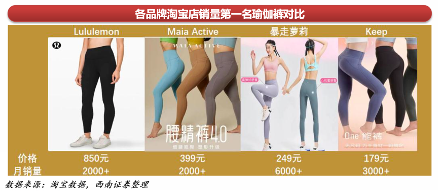 經(jīng)典案例:根據(jù)淘寶數(shù)據(jù)、西南證券等綜合資訊表明,隨著國(guó)內(nèi)品牌的崛起,及消費(fèi)者審美的提高,近幾年國(guó)內(nèi)小眾的瑜伽健身服裝品牌紛紛出圈,獲得消費(fèi)者喜愛。比如Maia Active也是做瑜伽褲出圈,一條瑜伽褲的均價(jià)在300- 400人民幣,比Lululemon瑜伽褲的均價(jià)便宜一半,是Lululemon 平替的較好選擇。