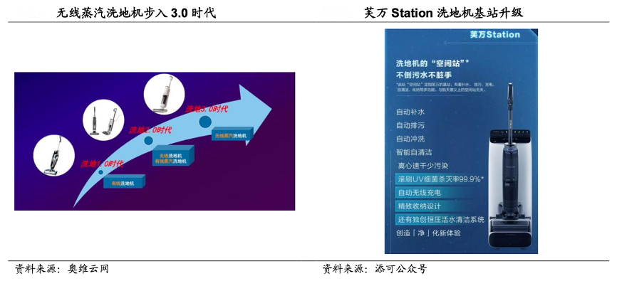 經(jīng)典案例:根據(jù)奧維云網(wǎng)、添可公眾號(hào)、國海證券研究所等綜合資訊表明,無線蒸汽洗地機(jī)開啟行業(yè) 3.0 時(shí)代,基站自動(dòng)化升級(jí)解決清洗痛點(diǎn)。2022 年 8 月安克創(chuàng)新子品牌悠飛馬赫推出無線蒸汽洗地機(jī) V1 Ultra, 隨后追覓推出 T12,添可推出芙萬 Steam2.0,實(shí)現(xiàn)高溫清潔除菌,針對(duì)性解決養(yǎng)寵一族、重度清潔愛者、精致寶媽等核心用戶需求。