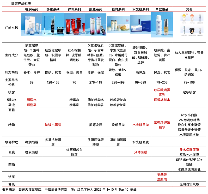 經(jīng)典案例:根據(jù)頤蓮天貓旗艦店、中信證券研究部等綜合資訊表明,頤蓮現(xiàn)擁有嘭潤、多重、鮮養(yǎng)、肌源、凝時、水光肌產(chǎn)品系列,同時開發(fā)了補水噴霧、元氣精華、氨基酸潔顏泡、 玻尿酸調(diào)理冰川水等產(chǎn)品。品牌以玻尿酸+其他功效成分,覆蓋保濕、美白、抗老、修護等多個功效。在價格帶方面,頤蓮主要產(chǎn)品落在 80~200 元大眾價格區(qū)間。