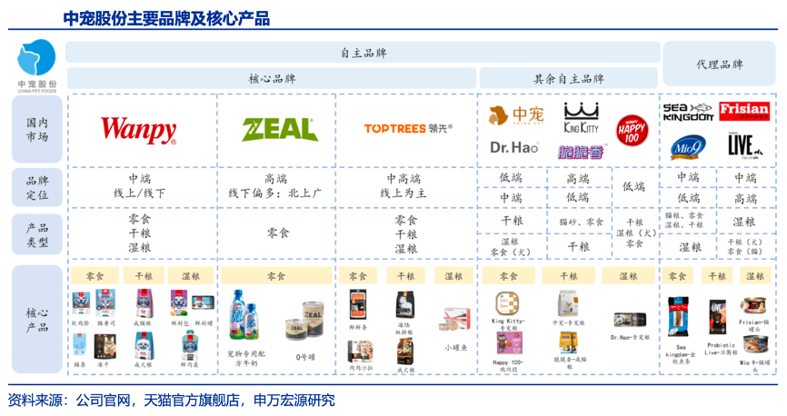 經(jīng)典案例:根據(jù)公司官網(wǎng)、天貓官方旗艦店、申萬(wàn)宏源研究等綜合資訊表明,中寵股份公司逐步形成了以頑皮、Zeal、領(lǐng)先為核心的自主品牌矩陣,三者合計(jì)貢獻(xiàn)公司 80%以上的境 內(nèi)營(yíng)收。其將三大核心自主品牌采用差異化品牌定位,頑皮為大眾品牌,定位中端,產(chǎn)品品類(lèi)最廣,以“鮮”為品牌標(biāo)簽;Zeal 為高端品牌,定位一線城市,以“新西蘭原裝進(jìn) 口”、“天然”為核心賣(mài)點(diǎn)。