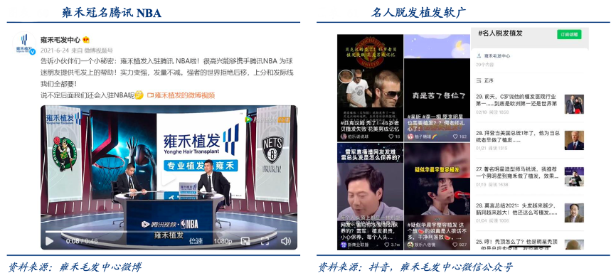 經(jīng)典案例:根據(jù)雍禾毛發(fā)中心、抖音、雍禾毛發(fā)中心微信公眾號、華創(chuàng)證券等綜合資訊表明,現(xiàn)今行業(yè)獲客成本仍然高企,2018~2021H1 雍禾公司銷售費用率平均值為 51.3%,處于較高水平。2021H1 公司冠名騰訊 NBA 賽事并投放小視頻等,銷售費用率提高至 54.8%,凈利率水平隨之拉低。