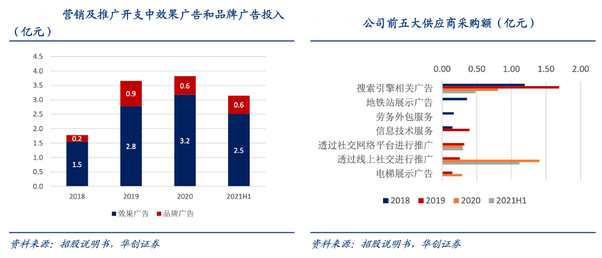 經(jīng)典案例:根據(jù)招股說明書、華創(chuàng)證券等綜合資訊表明,雍禾銷售費用中營銷及推廣開支占近 7 成,其中線上渠道占比營銷推廣費用近 8 成,主要以 效果廣告為主,2020年公司投入效果廣告 3.2 億元,占總營銷費用約40.7%。根據(jù)公司披露的前五大供應(yīng)商,公司主要投放搜索引擎類廣告和線上社交廣告,百度、微博、嗶哩嗶哩和抖音為公司主要的投放平臺,品 牌廣告占總營銷費用比重則從 2018 年的 5.0%提升至 21H1 的 11.0%。