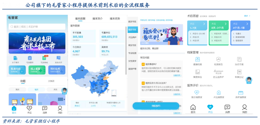 經(jīng)典案例:根據(jù)毛管家微信小程序、華創(chuàng)證券等綜合資訊表明,雍禾公司致力于推動就醫(yī)服務(wù)標(biāo)準(zhǔn)化,在微信小程序推出毛管家小程序,除了提供科普服務(wù)、咨詢服務(wù)、預(yù)約服務(wù)、商品購買商城等,還構(gòu)建了健康檔案管理和發(fā)友心得交流等平臺,基本搭建了從術(shù)前到術(shù)后的全流程數(shù)據(jù)管理體系。截至 2021 年 12 月,毛管家已擁有 81.1 萬名注冊用戶。