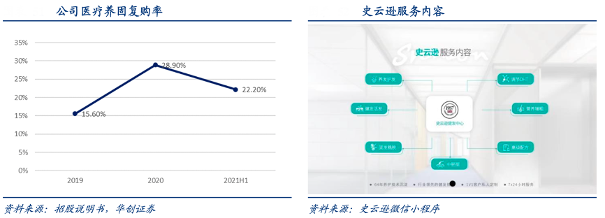 經(jīng)典案例:根據(jù)招股說明書、史云遜微信小程序、華創(chuàng)證券等綜合資訊表明,雍禾對于暫時不需要植發(fā)的患者,通過提供醫(yī)療養(yǎng)固服務(wù)也可以完成到店轉(zhuǎn)化,且目前已有一定比例的客戶為植發(fā)前養(yǎng)護,養(yǎng)固與植發(fā)相互導(dǎo)流,形成閉環(huán)。當(dāng)前公司醫(yī)療養(yǎng)固業(yè)務(wù)復(fù)購率介于 20-30%之間,2020年全年為 28.9%,21H1 為 22.2%,因大部分預(yù)付費套餐為 2 年內(nèi)使用完畢,因此復(fù)購率會有一定波動。