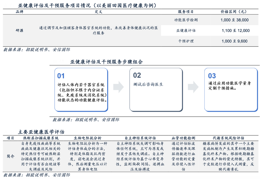 經(jīng)典案例:根據(jù)招股說明書、安信國際等綜合資訊表明,傳統(tǒng)健康管理服務(wù)針對普通市民,一般由私營體檢機(jī)構(gòu)以傳統(tǒng) 臨床醫(yī)學(xué)的方式提供。亞健康評估及干預(yù)服務(wù)指通過調(diào)節(jié)及加強(qiáng)顧客身體器官系統(tǒng)的功能,來提升身體器官系統(tǒng)狀況,使用的主要產(chǎn)品或器械包括熱斷層掃描成像系統(tǒng)、還原型谷胱 甘肽等,主要針對高凈值人群,由提供功能醫(yī)學(xué)服務(wù)的醫(yī)療機(jī)構(gòu)提供,指通過調(diào)節(jié)及加強(qiáng) 顧客身體器官系統(tǒng)的功能來改善顧客身體健康狀況。