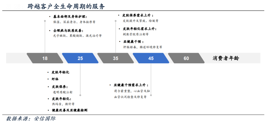 經(jīng)典案例:根據(jù)安信國際等綜合資訊表明,美麗田園公司主營傳統(tǒng)美容服務(wù)業(yè)務(wù),自 2011 年起進(jìn)軍醫(yī)療美容服務(wù),打開第二條成長曲線,2018 年開始發(fā)展亞健康評估及干預(yù)服務(wù),開拓未來增長的第三大支柱。公司提供多樣化美麗與 健康管理服務(wù),涵蓋 47 類服務(wù)項目及超過 800 個 SKU,跨越客戶全生命周期。