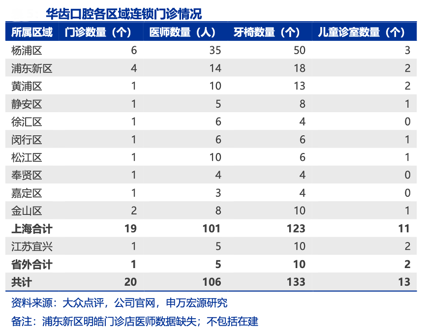 經(jīng)典案例:根據(jù)大眾點(diǎn)評(píng)、公司官網(wǎng)、申萬(wàn)宏源研究等綜合資訊表明,華齒口腔公司是口腔醫(yī)療服務(wù)商,主要向顧客提供口腔種植、口腔正畸、口腔修復(fù)和口腔診療等服務(wù)。目前公司在上海連鎖化經(jīng)營(yíng)有 19 家門診,1 家在建門診,1 家在建口腔醫(yī)院,公司在市內(nèi)各區(qū)通過(guò)門診擴(kuò)張的方式基本完成卡位布局。
