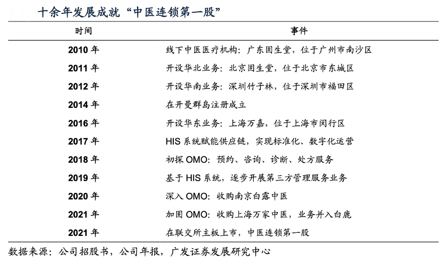 經(jīng)典案例:根據(jù)公司招股書、公司年報(bào)、廣發(fā)證券發(fā)展研究中心等綜合資訊表明,固生堂是一家中醫(yī)醫(yī)療健康服務(wù)提供商,通過線下醫(yī)療機(jī)構(gòu)及線上醫(yī)療健康平臺,為客戶提供全面的中醫(yī)醫(yī)療健康服務(wù)及產(chǎn)品。公司于2017年建立 HIS系統(tǒng)賦能供應(yīng)鏈,實(shí)現(xiàn)標(biāo)準(zhǔn)化、數(shù)字化運(yùn)營,分別于2020年和2021年收購線上 醫(yī)療健康平臺白露、萬家,進(jìn)一步深化了線上線下相結(jié)合的業(yè)務(wù)模式。